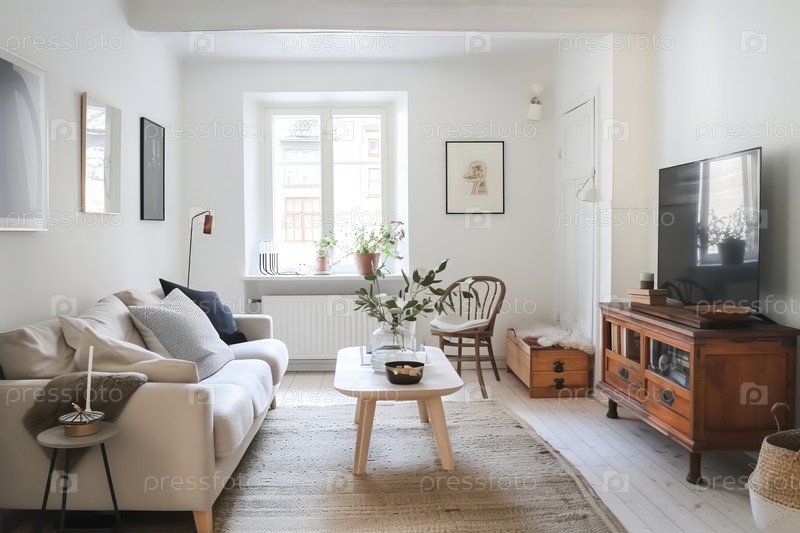 Гостиная в скандинавском стиле с белым диваном, телевизором, деревянным столом для кофе и окном.Минималистский декор сияет простотой и функциональностью
