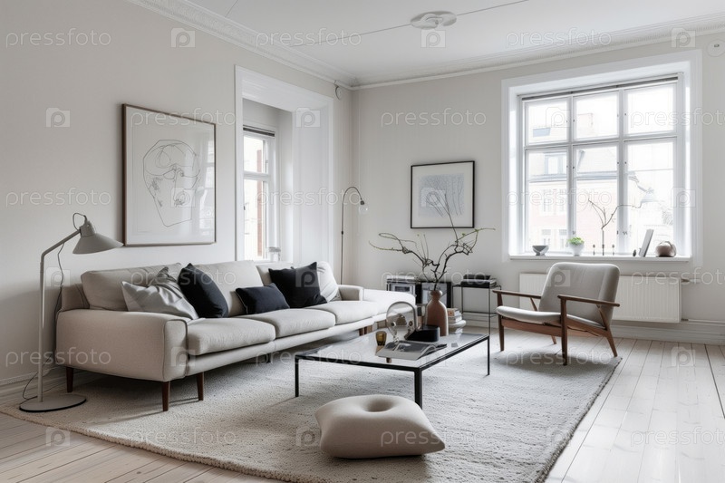 Современная скандинавская шикарная гостиная с белым диваном, кофейным столом, картинками на стене