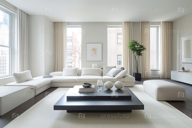 Современная гостиная с большими окнами, видом на город, белый секционный диван, низкий кофейный стол, большой белый ковер, нейтральные белые стены, мягкие бежевые шторы