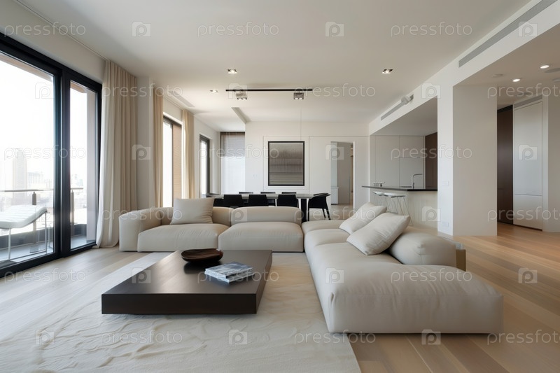 В современной минималистической гостиной есть большой секционный диван с подушками, гладкий кофейный стол и окна от пола до потолка