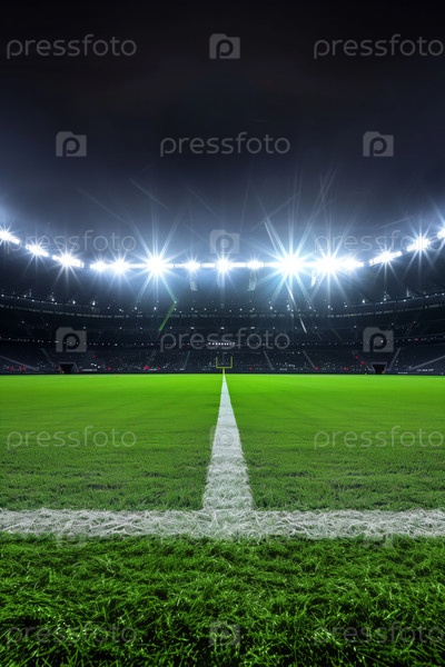 Большой футбольный стадион с пышным зеленым полем, освещаемым ночью