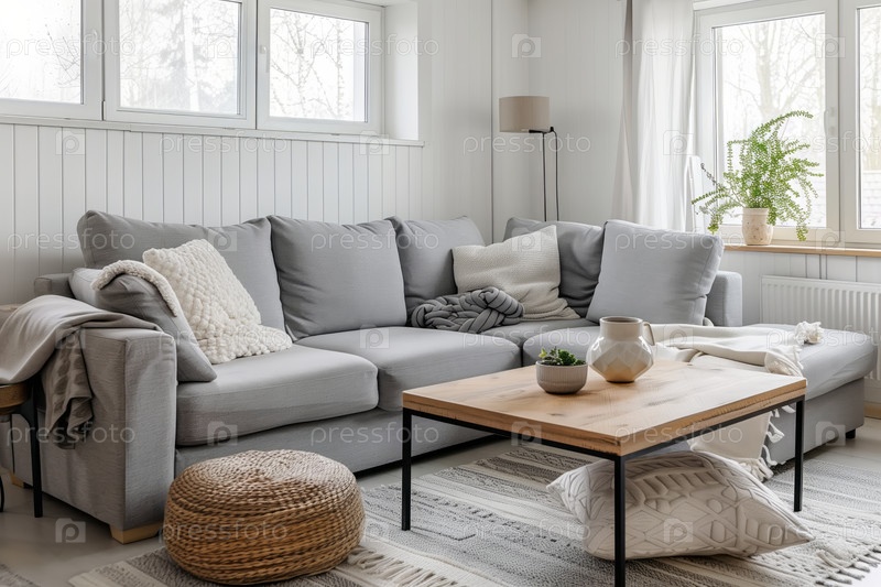 Яркая гостиная в минималистическом стиле с серым диваном, деревянным кофейным столом и комнатными растениями