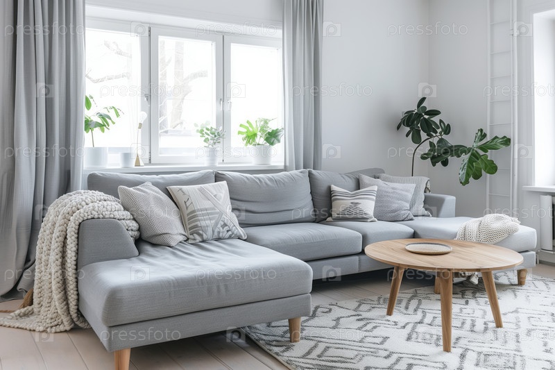 Яркая гостиная в минималистическом стиле с серым диваном, деревянным кофейным столом и комнатными растениями