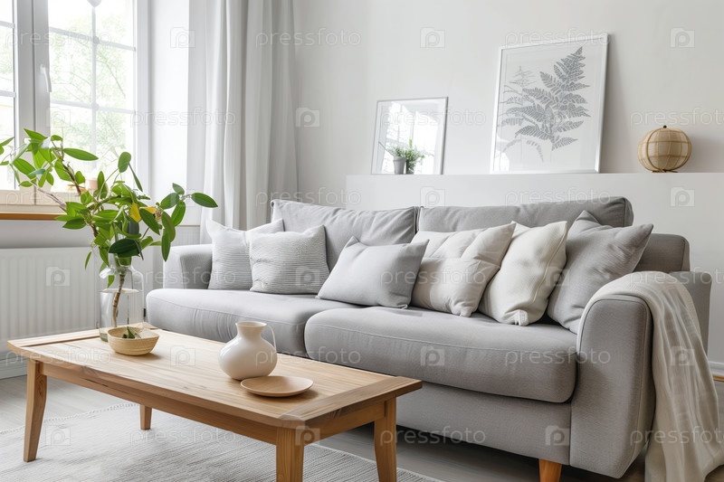 Яркая гостиная в минималистическом стиле с серым диваном, деревянным кофейным столом, комнатными растениями и произведениями искусства на стене