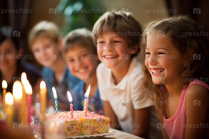 Улыбающиеся дети вдыхают свечи на торт, окруженные друзьями и семьей
