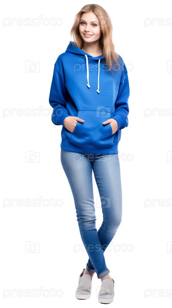 Красивая позитивная стильная модель девушки в синей капусте, полной длины, изолированной на прозрачном фоне