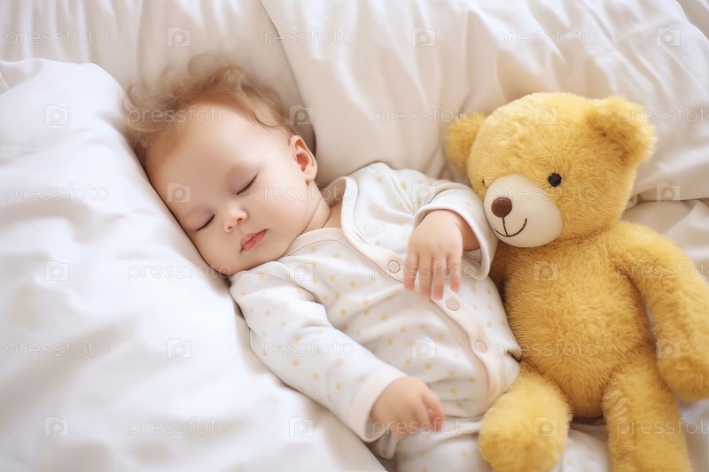 Милый новорожденный ребенок спит на кровати с плюшевым медведем