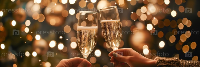 Два человека мигают стаканами шампанского на темном фоне с золотыми праздничными огнями по бокам