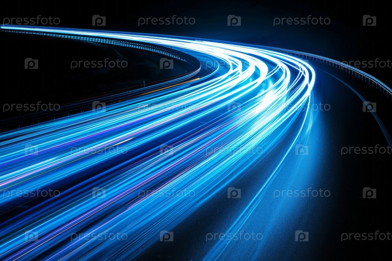 Длинная фотография голубого света на изогнутой дороге ночью