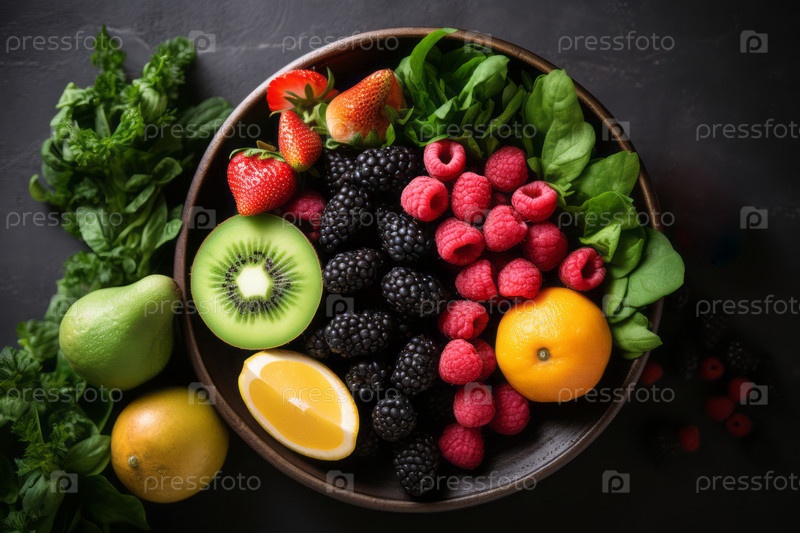 Яркая тарелка различных детоксицирующих продуктов с зелеными листьями и красочными ягодами, подчеркивая суть чистого питания