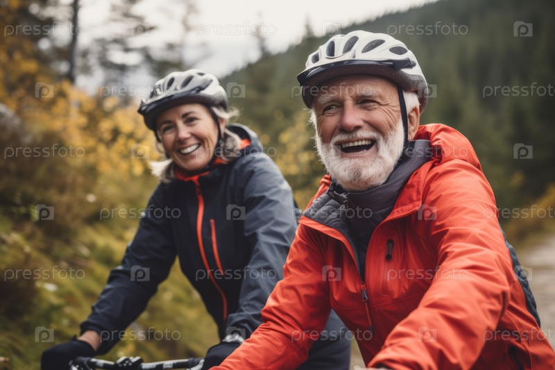 Счастливая пожилая пара едет на велосипеде вместе по живописной лесной тропе, социальные и активные мероприятия