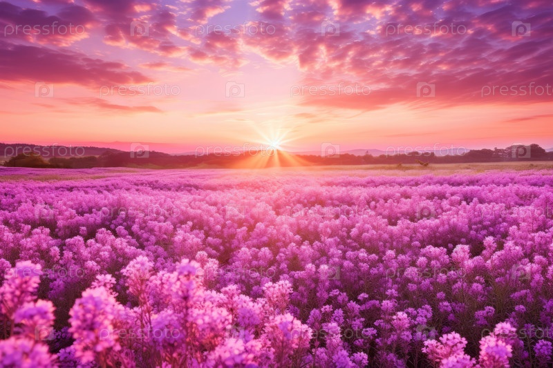 Закат солнца над полем фиолетовых цветов.Фональная информация, пространство для копирования, обои