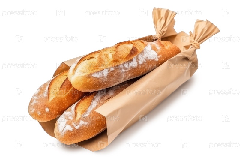 Свежие багетты из хлеба в бумажном мешке, изолированные на прозрачном фоне