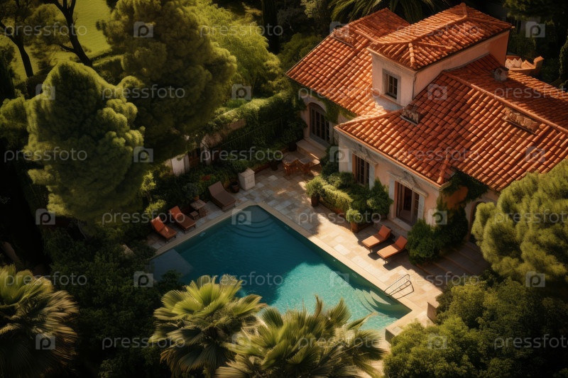 Вид с воздуха на терракотовые крыши средиземноморского дома и привлекательный бассейн, окруженный пышными зелеными деревьями и кустарниками