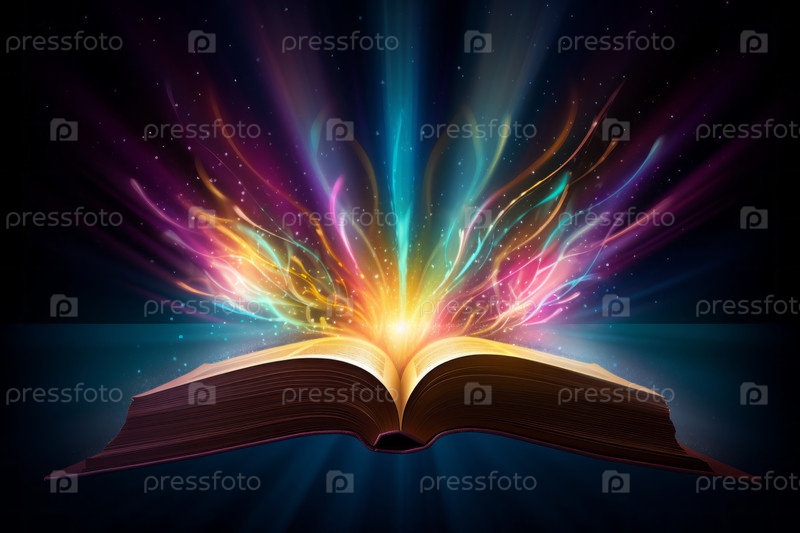 Иллюстрация, символизирующая силу знания, с открытой книгой с красочными лучами света, излучаемыми страницами, освещающими окружающую область