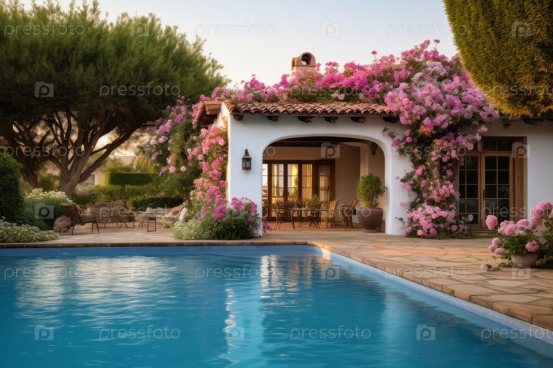Внешний вид средиземноморского дома с привлекательным бассейном, обрамленный красочными цветами, гармонией архитектуры и ландшафтного дизайна