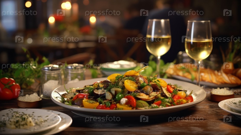 Элегантный гурманский ресторанный стол с блюдами из нескольких блюд, включая красиво покрытые блюда с акцентом на яркие свежие ингредиенты и бокалы вина