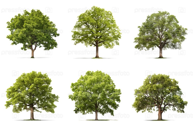 Набор различных типов деревьев: яблоня, бук, ольма, липа, кленовый, дубовый, изолированные на прозрачном фоне