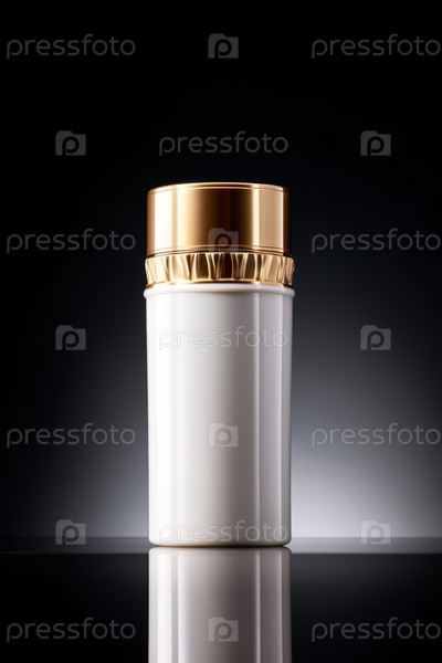 Белая труба для крема с позолоченной крышкой, с пустым пространством для макета на темном фоне студии со светофором