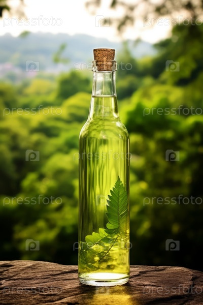 Стеклянная бутылка с пустым пространством для планировки, на естественном фоне с пышной зеленью в размытости