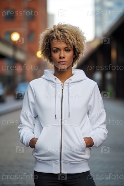 Стильная белая толстовка с капюшоном, которую носит красивая модная модель в городской обстановке