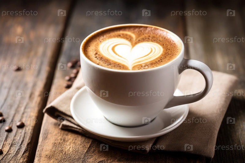 Закройте чашку капучино с латте сердца на деревянном столе