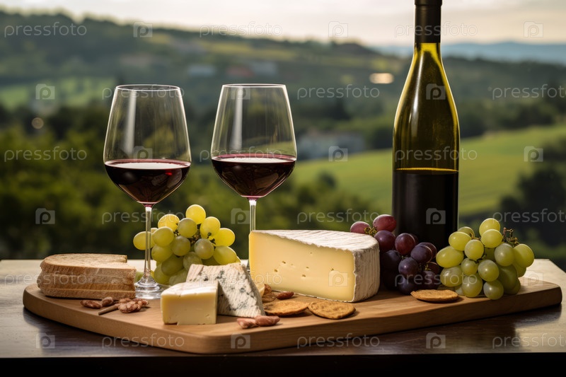 Живописная винно-сырная тарелка с выбором прекрасных сыров, винограда, бутылок вина и стаканчиков на фоне размытого пейзажа