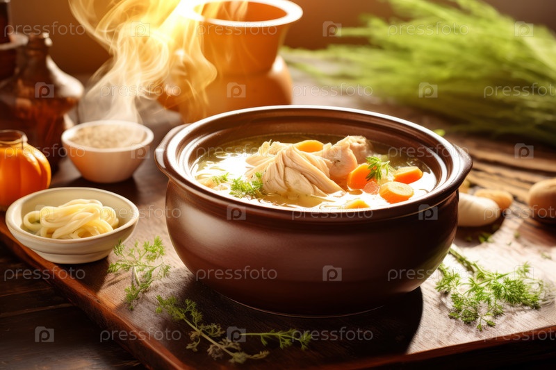 Покрыть вид на уютную сцену супа с поднимающейся миски куриный суп из лапши