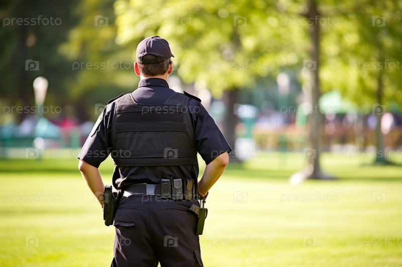 Задний вид охранника мужского пола с портативным радио и оружием против парка в размытом свете