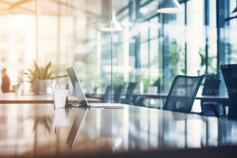 Яркий интерьер бизнес-офиса со стеклянными перегородками в размытой стороне стиля фона. низкая глубина поля зрения