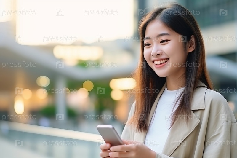 Молодая красивая азиатская женщина использует свой смартфон против городской обстановки в размытой форме