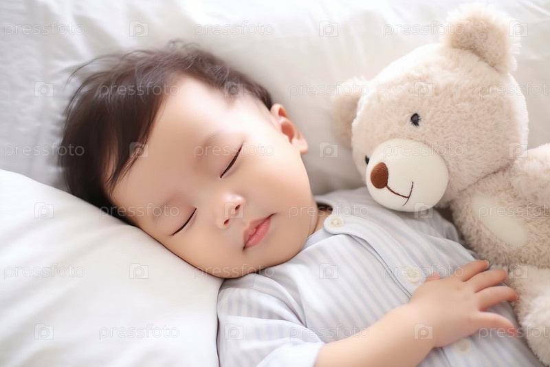 Милый новорожденный азиатский ребенок спит на кровати с плюшевым медведем