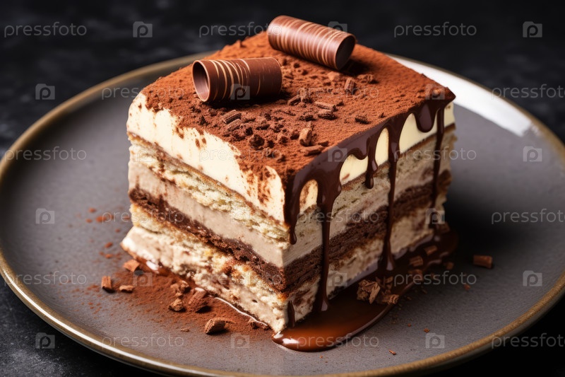Покройте вид на красиво покрытый десерт, слоями сливочного тирамису и пылью с какао-порошком и шоколадом