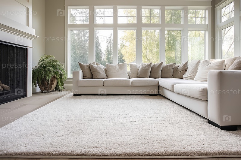 Интерьер современной гостиной с диваном, камином, комнатными растениями и белым ковром