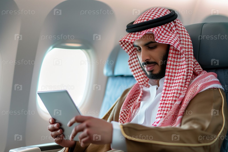 Арабский бизнесмен использует планшет в самолете во время деловой поездки