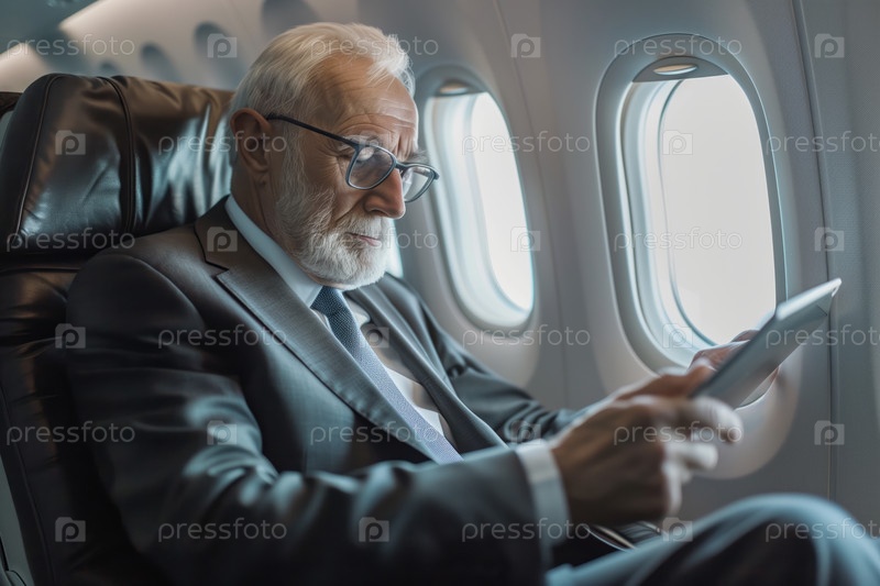Пожилой бизнесмен в костюме использует планшет на борту самолета во время деловой поездки