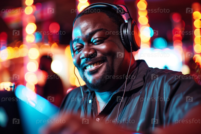 Счастливый афроамериканский ди-джей наслаждается своей музыкой на оживленной и красочной вечеринке, добавляя энергии и ритма к мероприятию