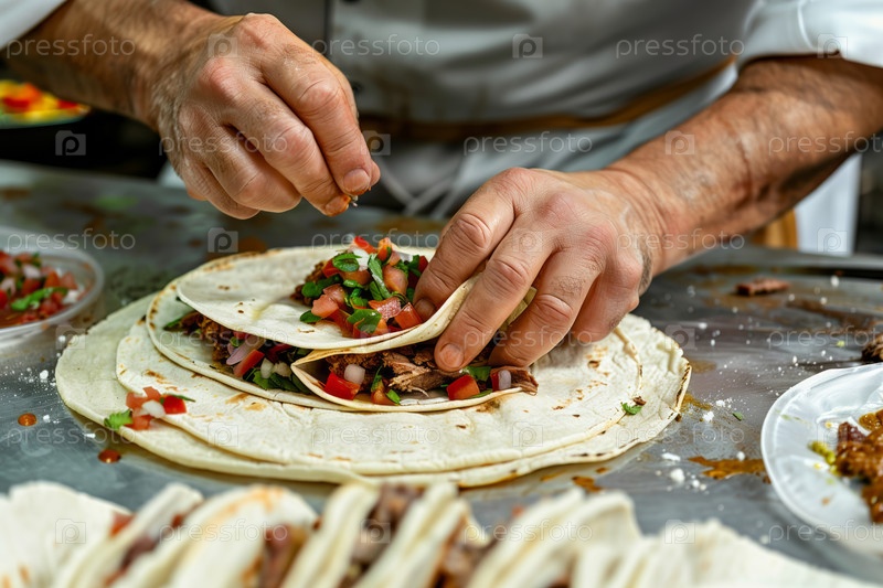 Шеф-повар умело готовит свежие тако с яркими начинками, демонстрируя мастерство мексиканской кухни в профессиональной кулинарии