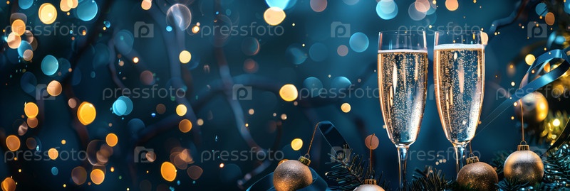 Широкий баннер с двумя звонкими бокалами шампанского, создавая атмосферу для празднования на темно-синем фоне со светом боке