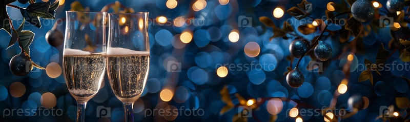 Широкий баннер с двумя звонкими бокалами шампанского, создавая атмосферу для празднования на темно-синем фоне со светом боке