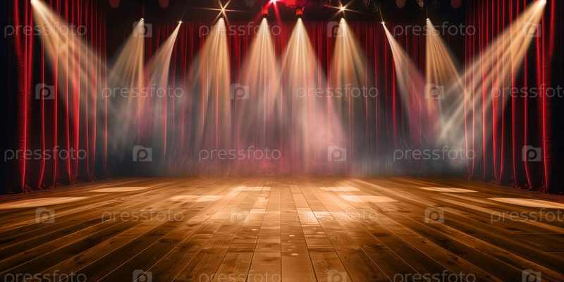 Большая деревянная сцена с красными занавесками и яркими прожекторами