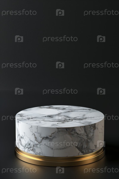 Белый мраморный цилиндрический подиум с позолоченными инкрустациями на темном фоне для презентации продукта