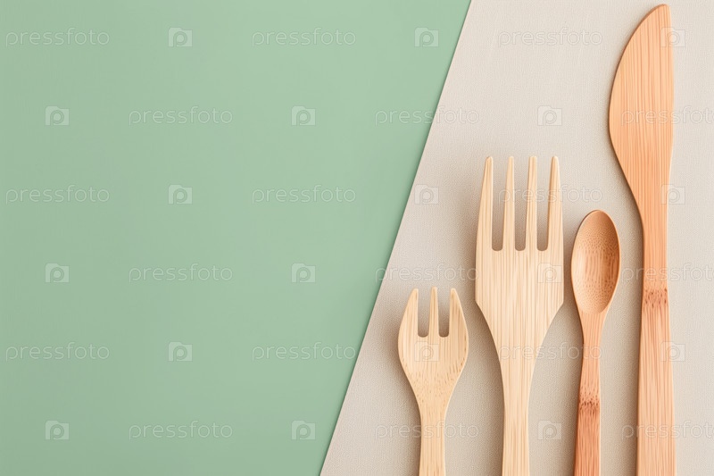 Минимальный набор деревянных столовых приборов расположен на чистом зеленом фоне с копировальным пространством, подчеркивая экологически чистые и устойчивые концепции жизни