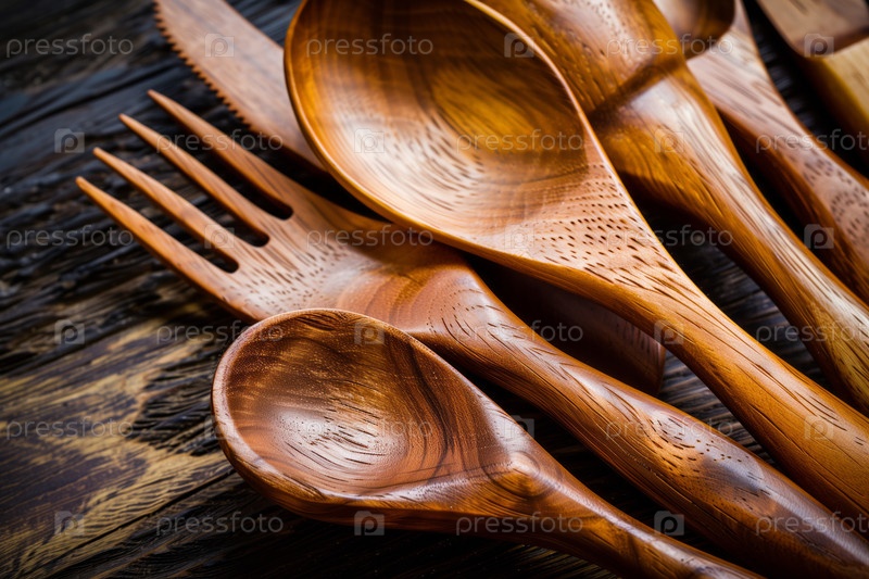 Закройте вид на деревянную столовую посуду, подчеркивая гладкие кривые и резные акценты