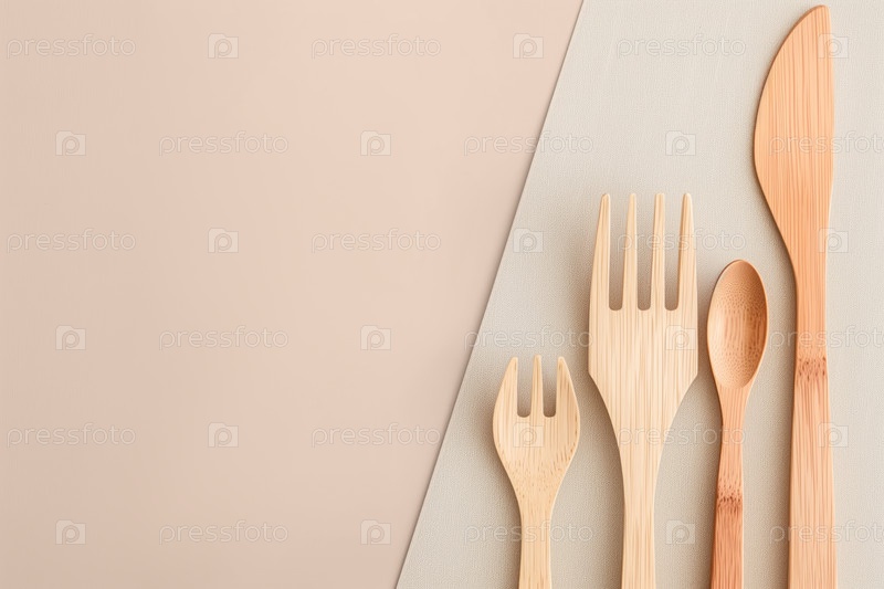 Минимальный набор деревянных столовых приборов расположен на чистом бежевом фоне с копировальным пространством, подчеркивая экологически чистые и устойчивые концепции жизни