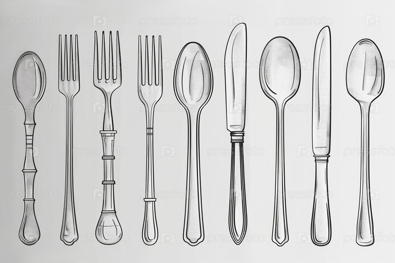 Черно-белый минималистический эскиз, показывающий различные конструкции столовых приборов, включая вилки, ножи и ложки