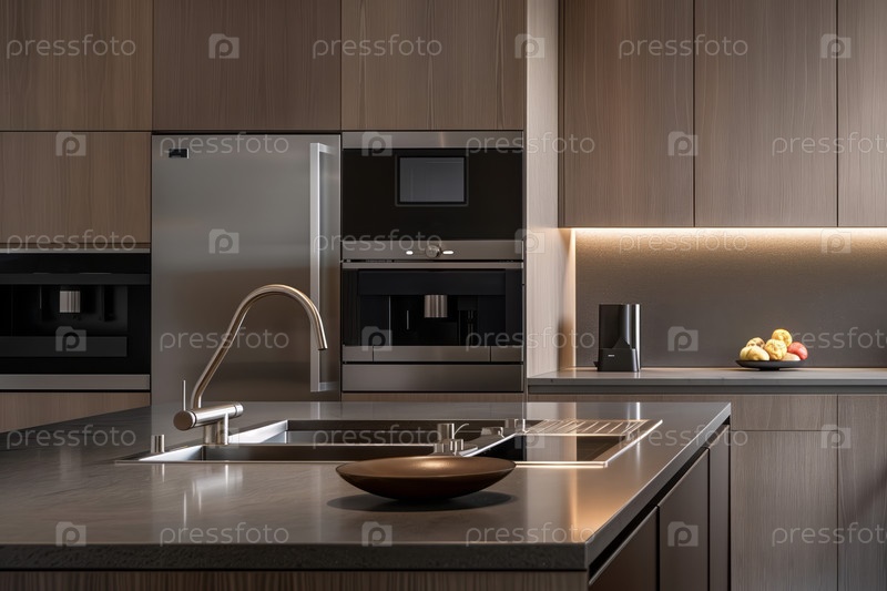 Интерьер современной кухни в минималистическом стиле с островом и бытовой техникой