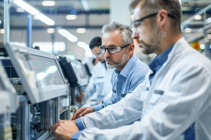 Работники концентрируются на детальных задачах сборки в современной фабрике перед экраном