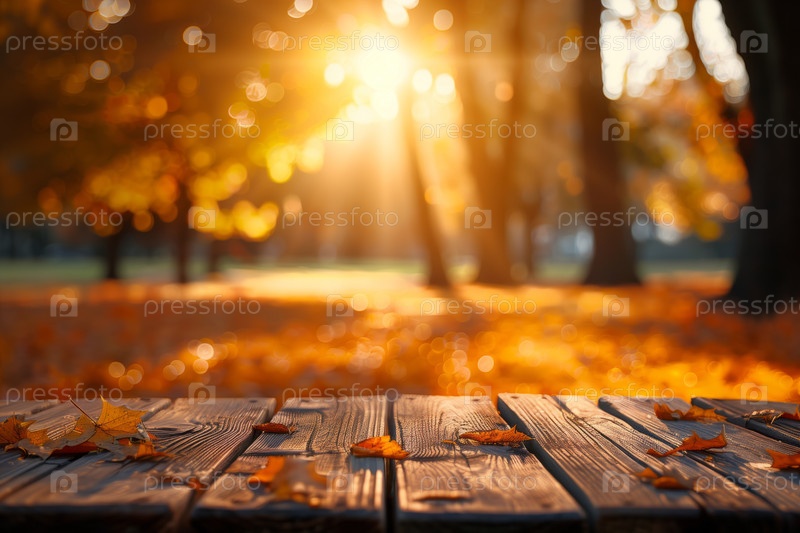 Пустой деревянный стол, окруженный тусклыми осенними листьями на закате
