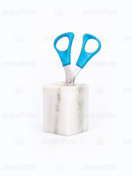 Ножницы в мраморной вазе, изолированной на белом фоне